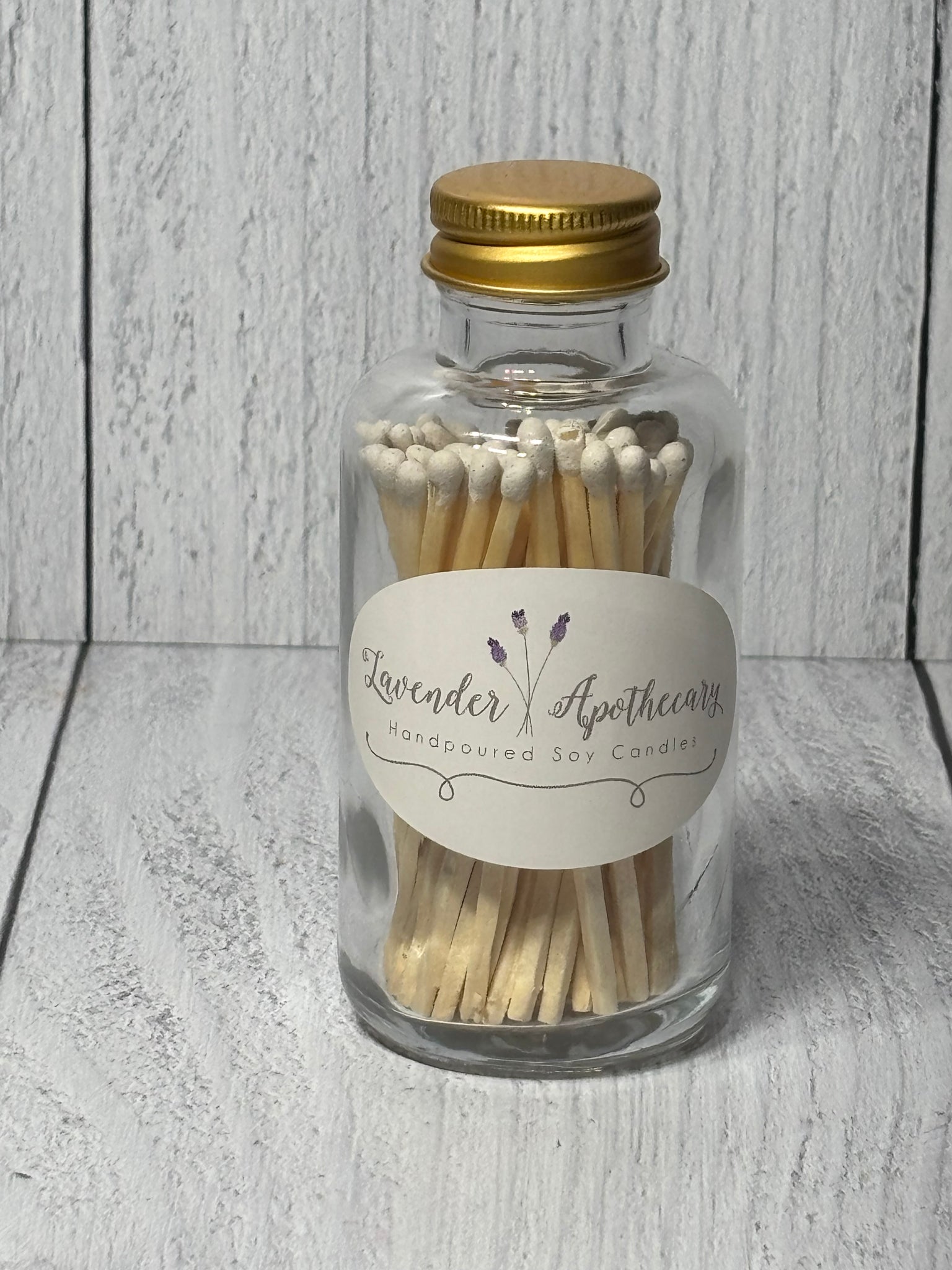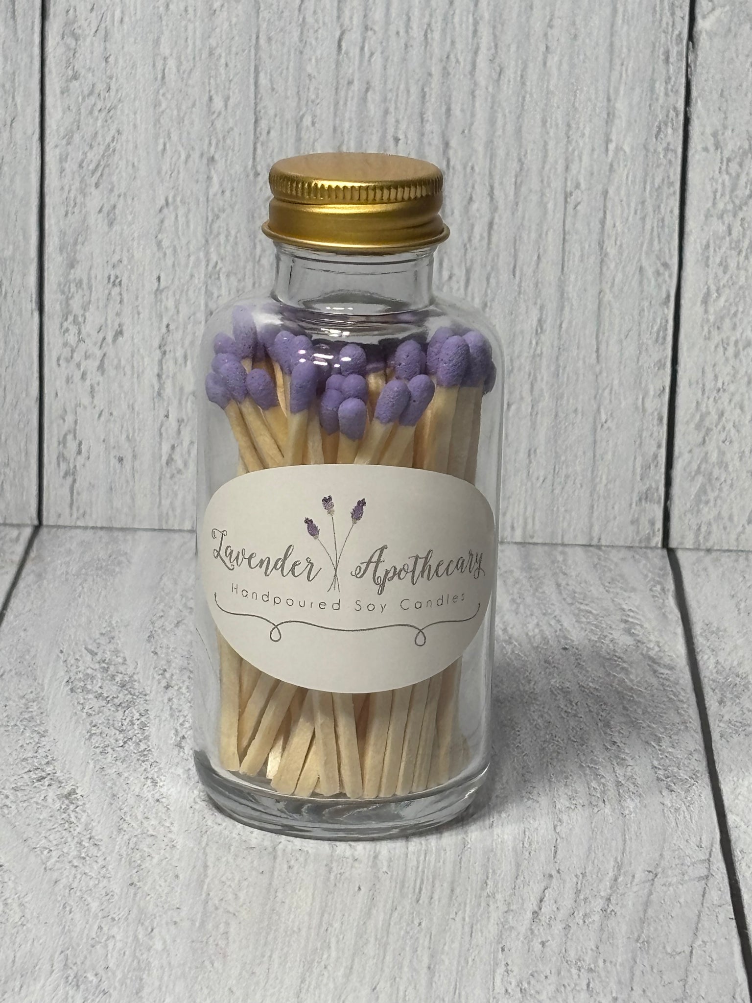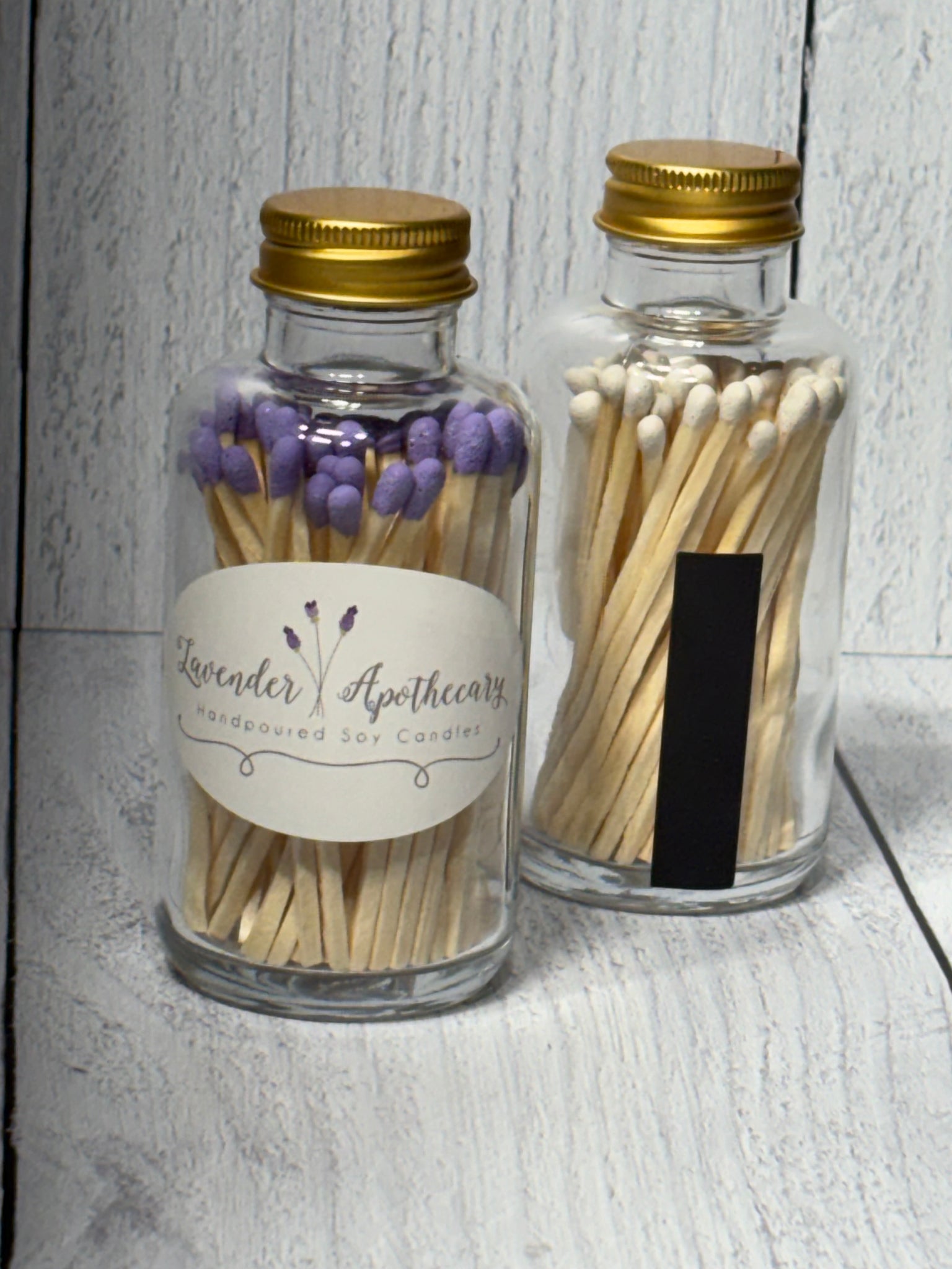 This jar is filled with wooden white or purple tipped matchsticks. This is the perfect candle accessory to conveniently place next to your candle. There are approximately 60 matchsticks in each jar and the striker is located on the back of the jar.