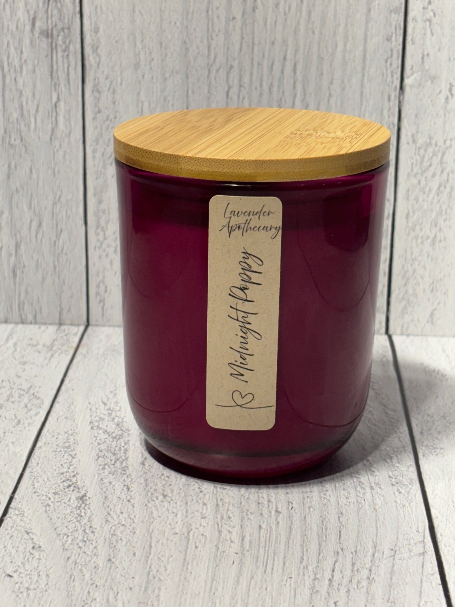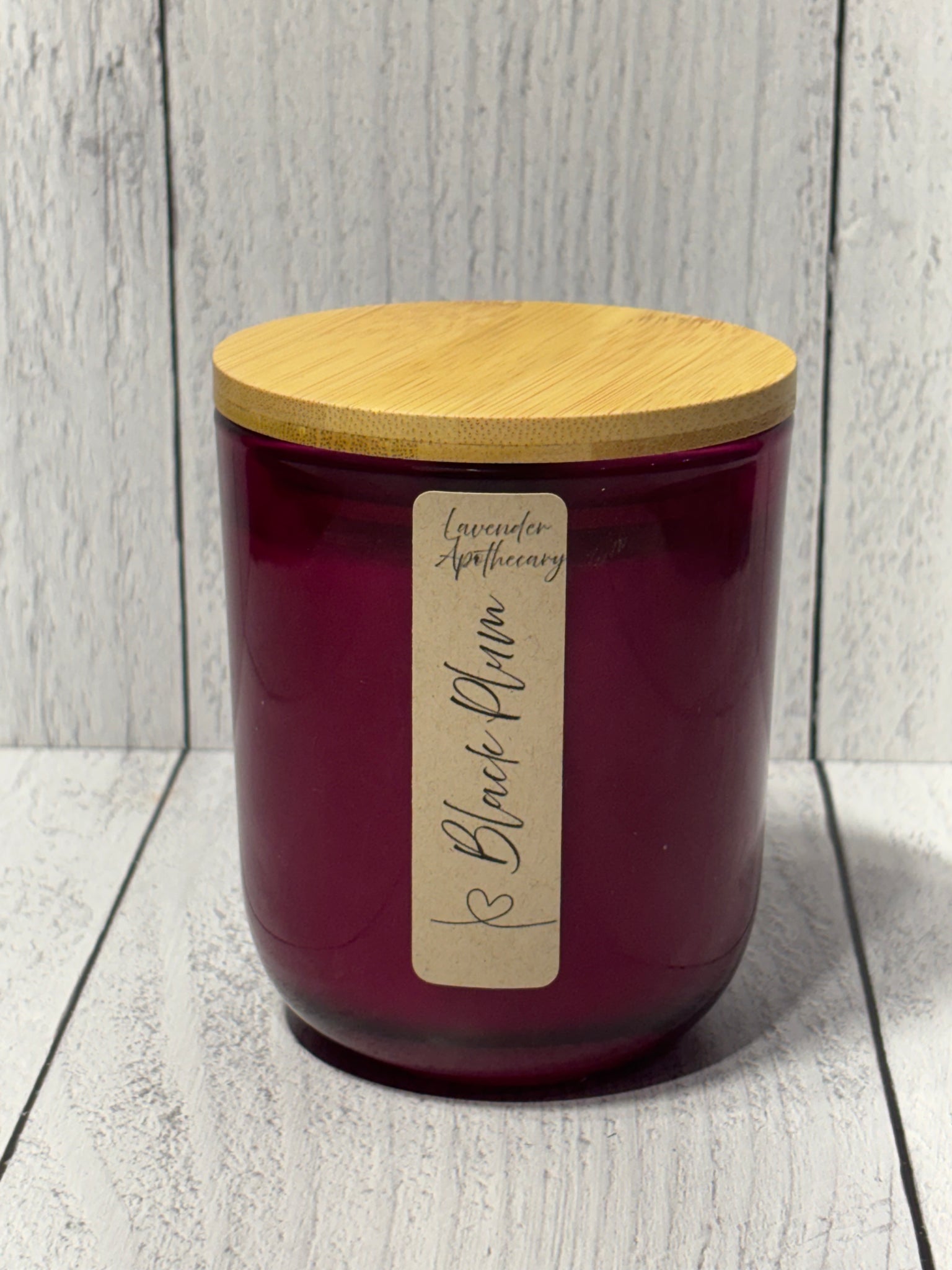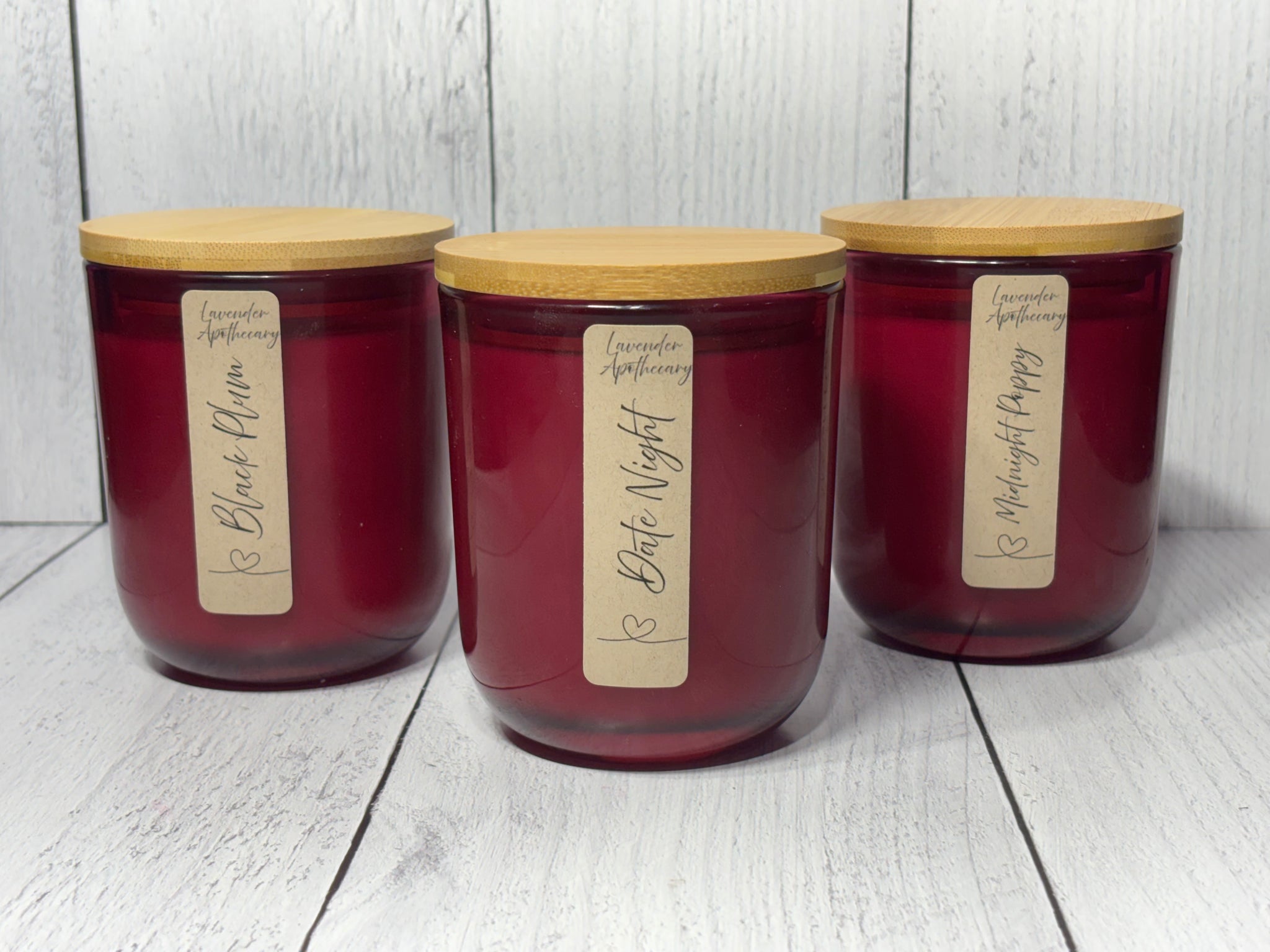 Meet our limited edition Merlot colored tumbler candles. The Merlot colored container is a stunning 14 ounce jar that is sleek and has a features a thick glass wall. It is topped off with a wooden bamboo lid. Pick from three rich fragrances described below: